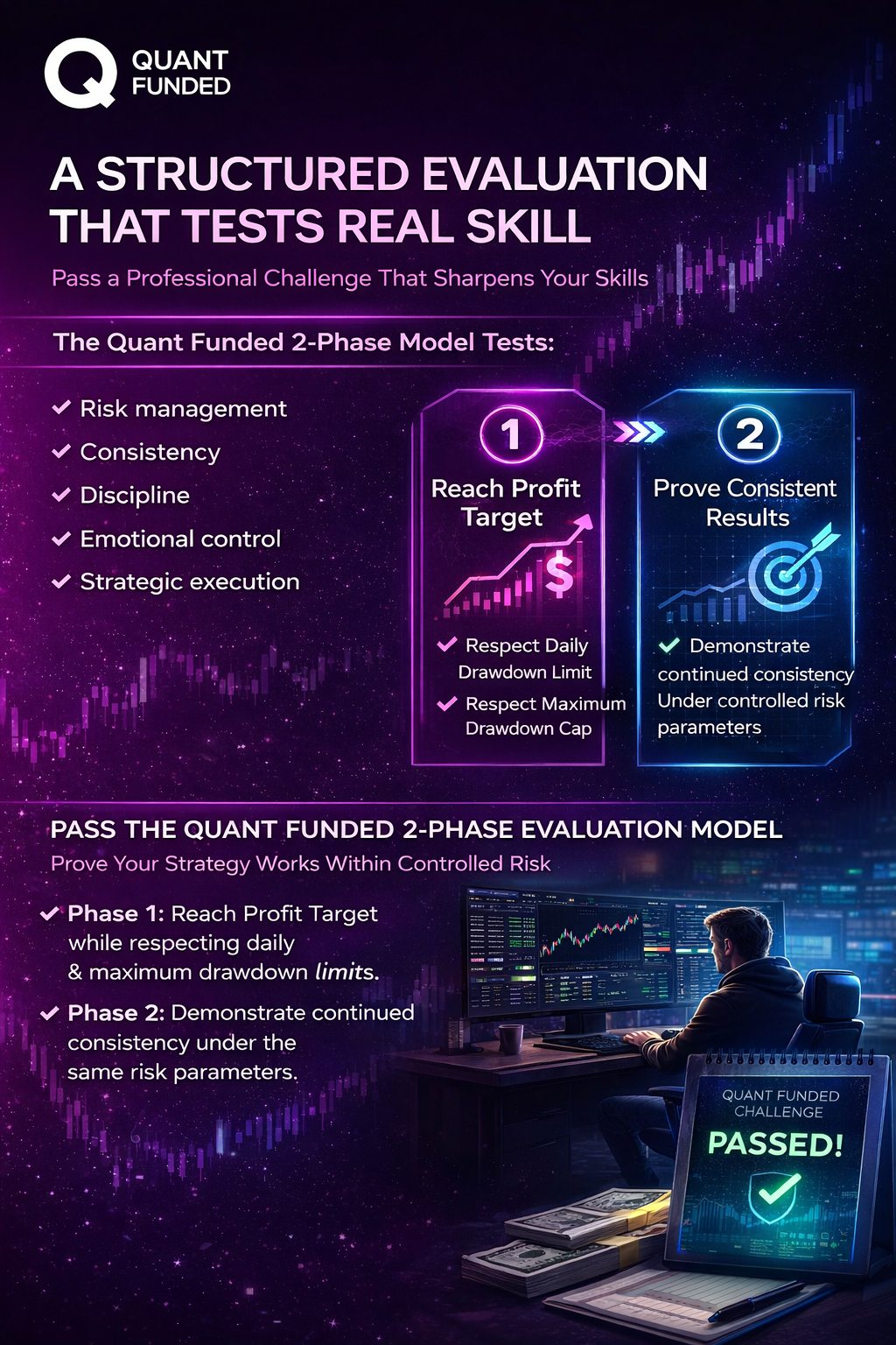 At Quant Funded, our 2-Phase Evaluation Model is designed to test: