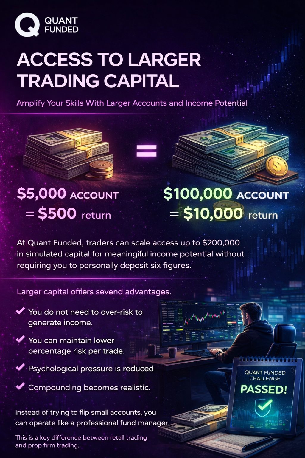 At Quant Funded, traders can scale access to accounts up to $200,000 in simulated capital. This creates meaningful income potential without requiring you to personally deposit six figures.