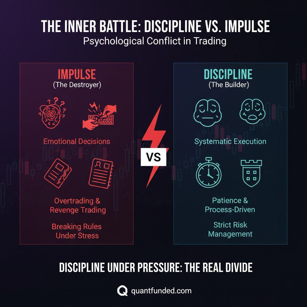 Understanding the psychological conflict between disciplined execution and impulsive decision-making is one of the most important steps toward becoming a consistently profitable trader — especially in a prop firm environment.