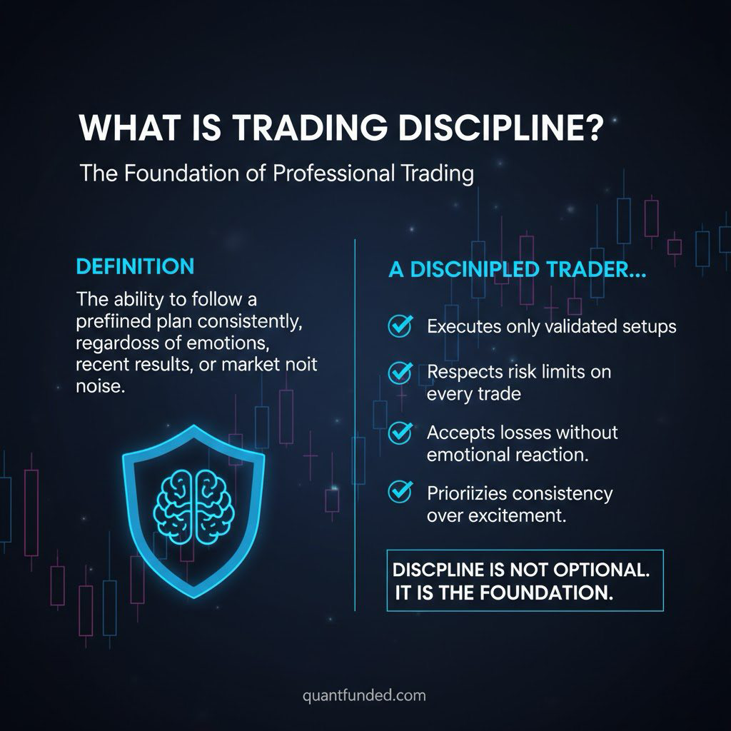 Trading discipline is the ability to follow a predefined plan consistently, regardless of emotions, recent results, or market noise.