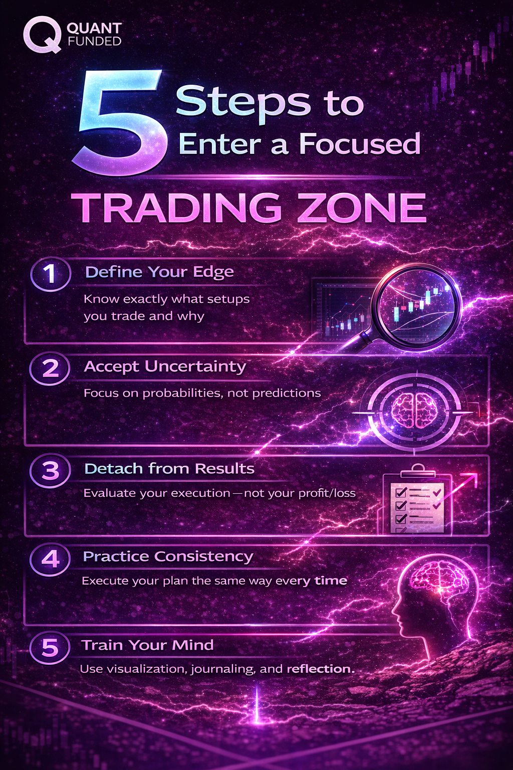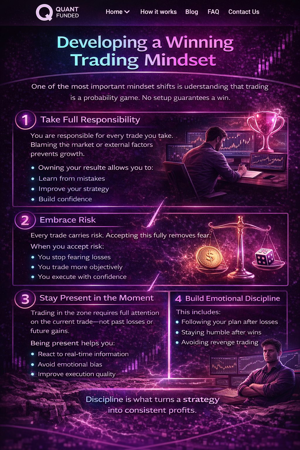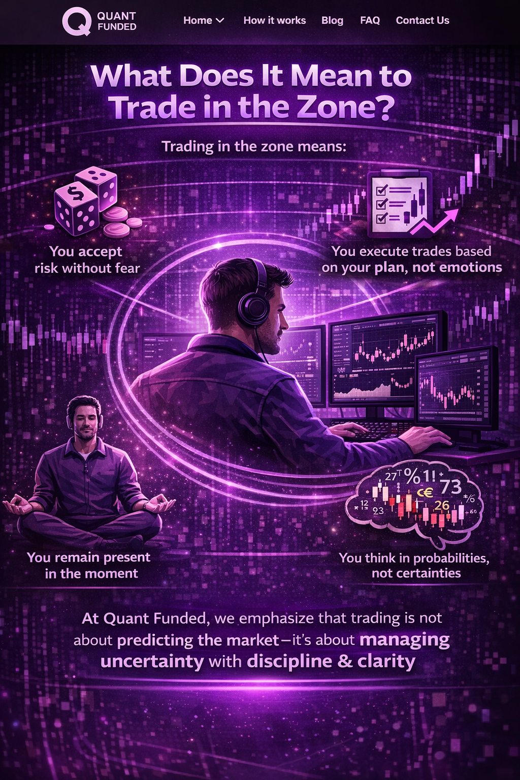 Keywords optimized: trading psychology, trade in the zone, trading mindset, emotional discipline trading, risk management trading, prop firm trading, Quant Funded, consistent trading profits