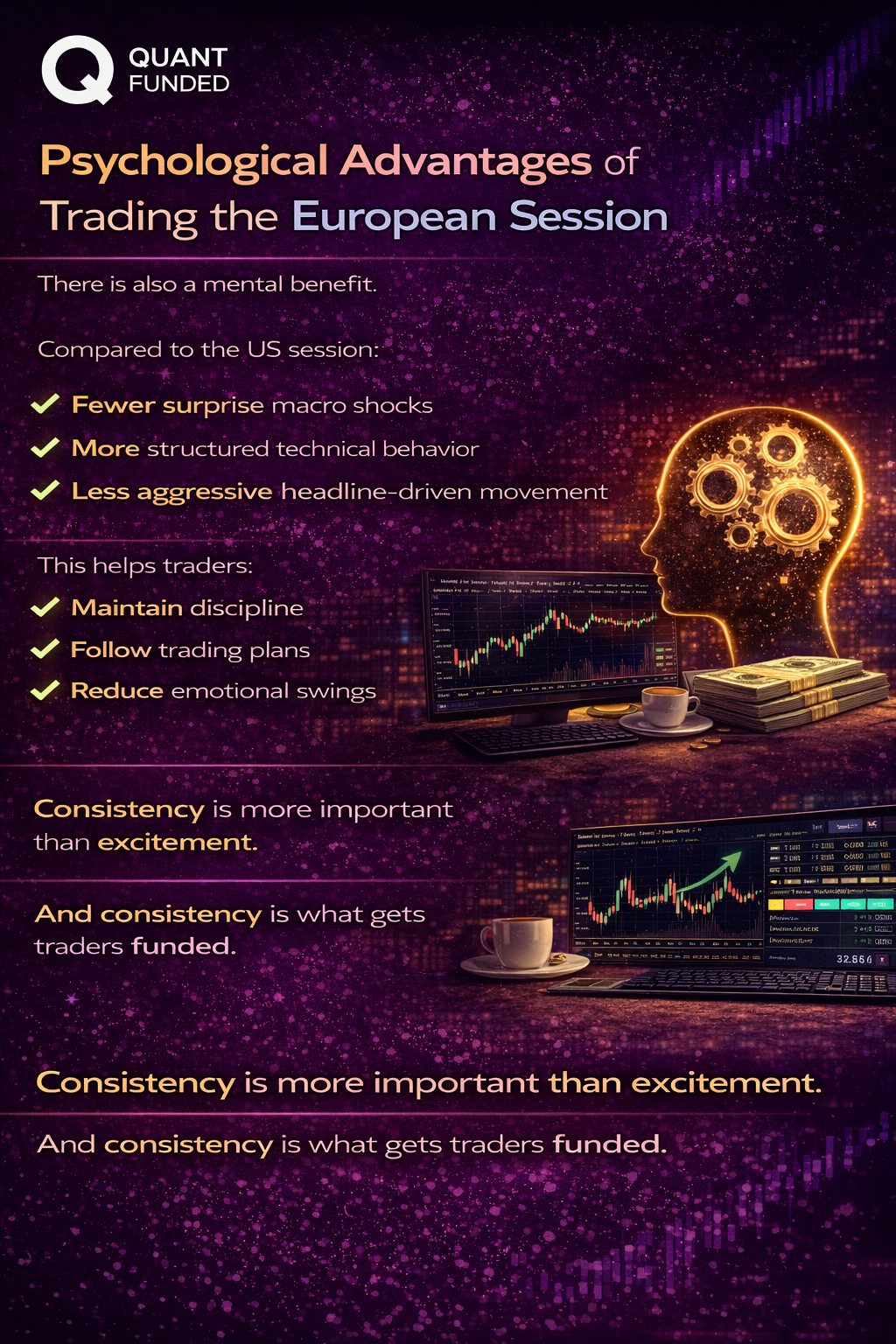 When trading under the Quant Funded evaluation model, discipline and risk management are essential. The European session supports this because it often provides: